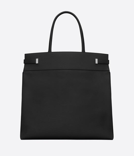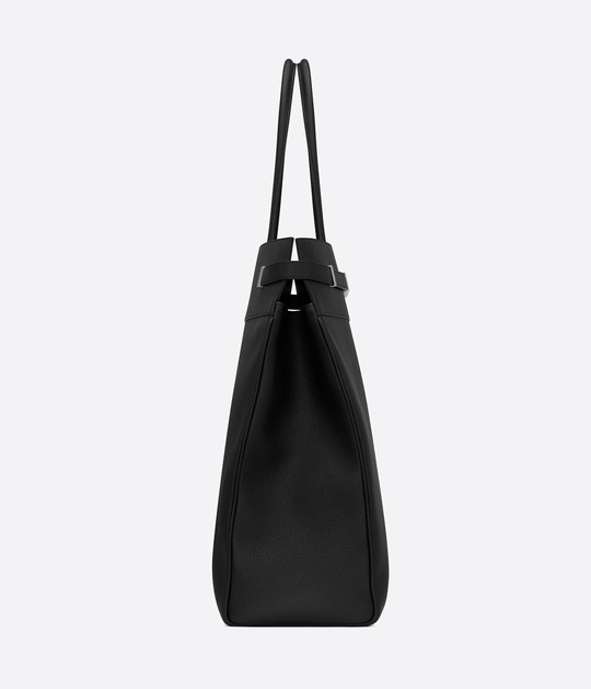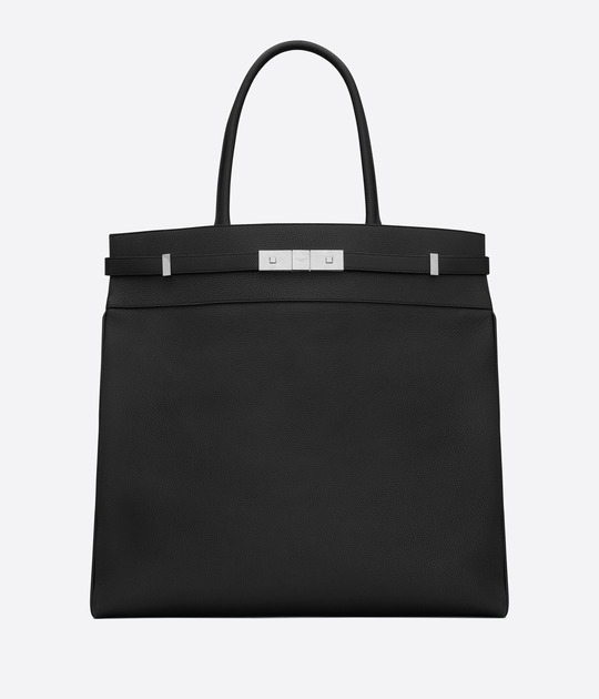 MANHATTAN N/S 托特包以豎版梯形輪廓亮相,采用黑色粒面皮革打造,飾有銀色金屬包扣,適合當作公文包或短途旅行包。