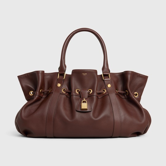 Abbey 手袋像是一只俏皮飽滿的餃子,采用「46x32x13cm」大容量廓形,柔軟粒面小牛皮通過抽繩束口,呈現浪漫花邊般的「褶裥」,包包中央懸垂一枚金色黃銅掛鎖,整體造型復古又慵懶。