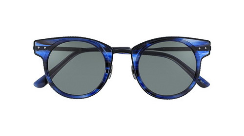 圓形中性化太陽眼鏡,柔美的蝴蝶形邊框,材料選用手工打磨醋酸酯,莫乃爾合金鏡腳鑄刻精細的編織圖案。經典柳釘加蔡司尼龍鏡片。
