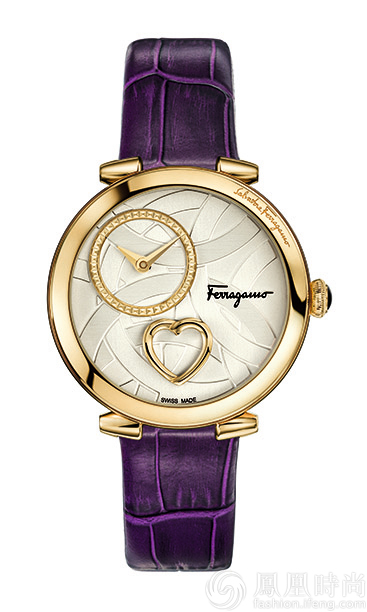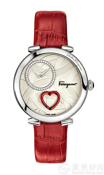 Cuore Ferragmo系列表盤以IP鍍金、精鋼或紅色琺瑯心形點綴,設計別致。在專利技術的驅動下,心形裝置每秒開合,宛如怦然心動般悸動著,極為引人注 目。其中秘密便是專為SaLVatore Ferragmo設計并制作的創新石英機芯。只需按壓表冠即可開啟該功能,而時間設定則采用特制的心形工具,可由2點位置的按鈕控制。圓形表殼搭配飾有 品牌標志Gancino圖案的銀色表盤。偏心時分指示器點綴一圈鉆石或巴黎釘紋雕刻圖案。Cuore Ferragamo腕表可選配雙色表鏈或鱷魚皮紋小牛皮表帶,后者有多種精致優雅的色彩可選:黃、黑、紅、紫、粉紅和灰色。