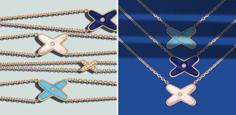 CHAUMET 首次將天然寶石運(yùn)用在Liens緣系•一生系列:其中代表?yè)肀c緣份的經(jīng)典“X”連結(jié)符號(hào)創(chuàng)新性選用了白色珍珠母貝、藍(lán)綠綠松石和藏青青金石,并以三維立 體工藝雕刻后再鑲嵌上一枚精致鉆石,色澤的搭配好似一股清泉,在陽(yáng)光照耀下熠熠生輝。從此,時(shí)髦情侶間又多了一種抒寫(xiě)浪漫的愛(ài)情宣言。