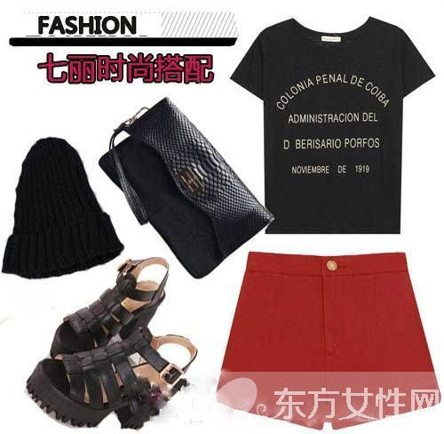 搭配單品:紅色高腰褲+黑色T恤+手拿包包+尖頂帽+涼鞋
