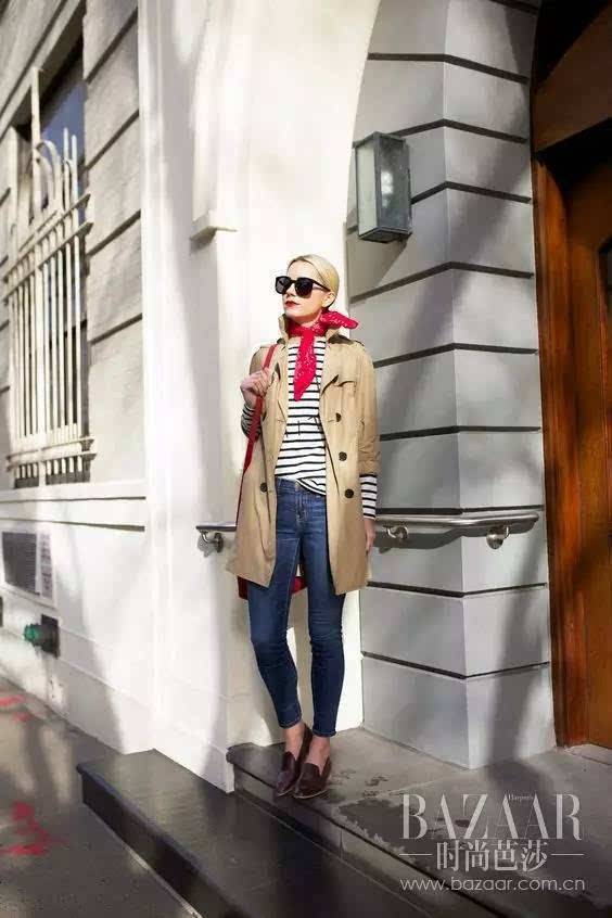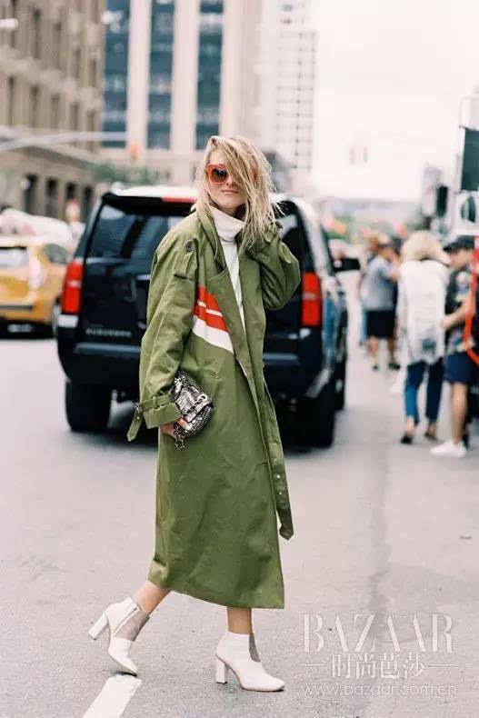 Oversize風衣本身已經(jīng)是時髦的代表,再選擇洋氣的軍綠色,還要加上創(chuàng)意的紅白條紋,想在人群中忽略你都難~