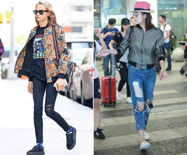 Kate Bosworth穿粉紅色棒球外套+直筒闊腿牛仔褲,帶有一種復古味的休閑運動風。