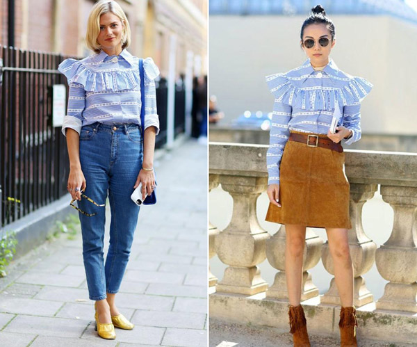 這樣的假一字領荷葉邊設計,算是今年的一個小爆款,而且藍色小條紋還是那么的顯氣質呢~