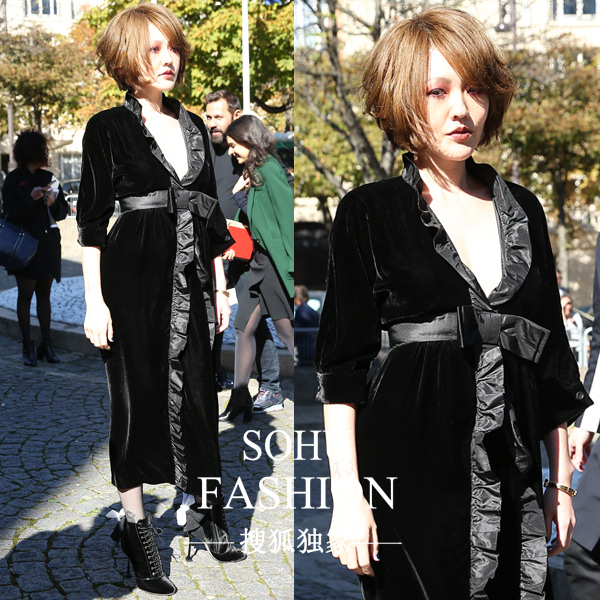 小s身穿miu miu 2016秋冬系列亮相品牌2017春夏大秀場外,天鵝絨材質的深V浴袍加上褶皺蝴蝶邊設計,配以精致的妝容,整體性感而又嫵媚。
