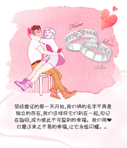 傳說(shuō),左手無(wú)名指擁有【愛情之脈】,那么,把您的名字刻上我們專屬的戒指,代表我們始終不渝的愛,是我們永恒的幸福,使我們對(duì)彼此光輝未來(lái)的承諾,緊牽你的手,讓我們攜手揭開幸福美滿的新一頁(yè)。