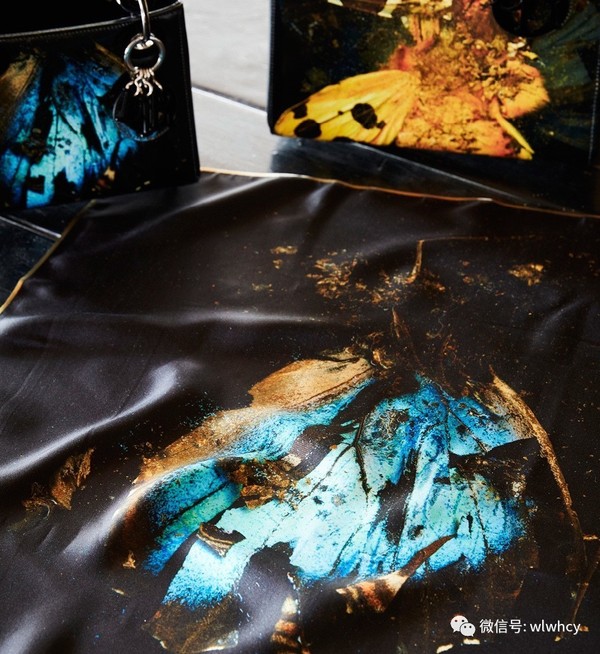 在與Dior迪奧的合作中,兩只身姿靈動的蝴蝶分別呈現出日光黃和月色藍的色調,翅膀上有著近乎真實的絲絨質感。