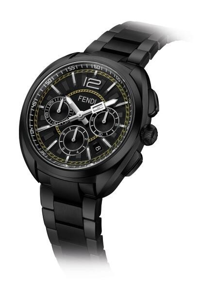 Fendi Timepieces全新推出的這款腕表采用46毫米表殼,表盤上設有三個計時盤,搭配拋光和緞光磨砂金屬表鏈,打造優雅外觀。黑色表盤搭配白色速度計刻度軌道和由FENDI標識構成的品牌標志性的黃色分鐘軌道,于鮮明對比間盡顯優雅風范,將該表塑造為純正的高端運動表。
